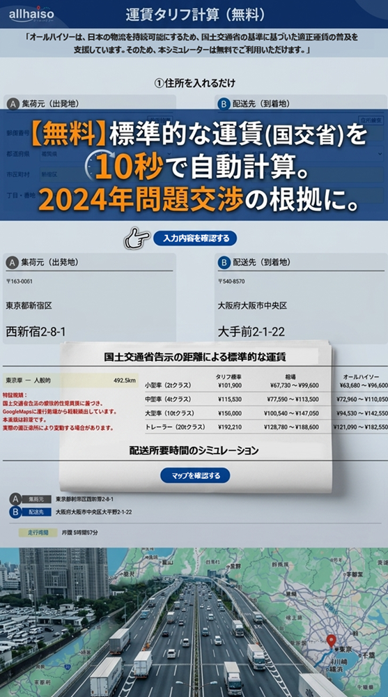 【無料】標準的な運賃(国交省)を10秒で自動計算。2024年問題交渉の根拠に。